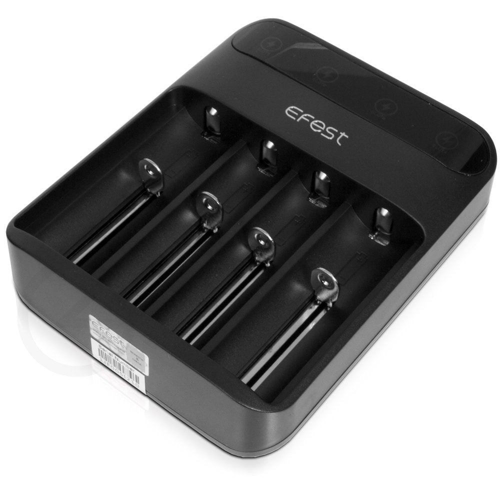 The Efest Lush Q4 Battery Charger is a vape battery charger, that can simultaneously charge up to four batteries. The Q4 has three charging modes with different Amp outputs; there's speedy 2A charging when one battery is inserted, 1A charging when two batteries are charging, and 0.5A charging when four batteries are inserted. The four spring-loaded bays allow for quick and secure installation of batteries.